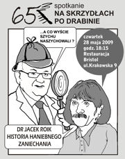Jacek Roik, przez wielu oskarżany o uprawianie szaleństwa, nieomal szarlatanerii, mający w swym szaleństwie za wspólnika profesora Juliana Aleksandrowicza.Gościowi towarzyszyć będzie redaktor Zygmunt Szych, autor obszernego wywiadu z lekarzem. Całość spotkania opleciona będzie muzyką i pieśnią w wykonaniu tarnowskich artystów - Wiesława Ochwata i Chóru Kameralnego “Cantores Sanctae Familiae”. Zainteresowani posiadaniem nowej książki dr Roika oraz autografem bohatera i autora , będą mieli możliwość zrealizowania jednego i drugiego, bowiem dla uczestników 65. spotkania zarezerwowano część nakładu wydawnictwa. Tytuł książki brzmi podobnie jak nazwa skrzydlatego spotkania - “Dr Roik. Historia haniebnego zaniechania”.