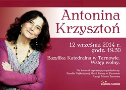 W piątek 12 września w Bazylice Katedralnej w Tarnowie o godzinie 19.30 rozpocznie się koncert Antoniny Krzysztoń. Wstęp jest wolny. Koncert współorganizują Urząd Miasta Tarnowa i parafia katedralna.