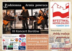 Zwieńczeniem gali będzie, jak co roku, koncert bardów. Tym razem z programem „Podziemna Armia Powraca” wystąpią: Jerzy Zelnik, Leszek Czajkowski i Paweł Piekarczyk. Wstęp na galę i koncert jest wolny.Bezpłatne wejściówki rozprowadza Tarnowskie Centrum Informacji przy Rynku 7. Można je również rezerwować elektronicznie, pisząc maila na adres: wejściówki@intarnet.pl