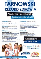 Tysiąc bezpłatnych badań poziomu cukru, 300 kg jabłek do rozdania i darmowe porady prozdrowotne – to elementy akcji prozdrowotnej „Tarnowski Rekord Zdrowia. Mniej cukru - poczuj smak”. Pierwsze bezpłatne badania poziomu cukry odbędą się 11 listopada.