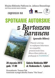 Na wieczór autorski z Bartoszem Baranem zaprasza Miejska Biblioteka Publiczna w Tarnowie w środę, 28 stycznia o godzinie 17.00. Spotkanie odbędzie się w Galerii Niebieskiej przy ulicy Krakowskiej 4.