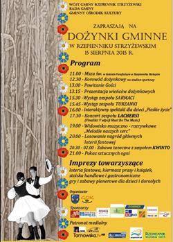 Po nabożeństwie korowód dożynkowy przejdzie na stadion sportowy. Organizatorzy – Wójt oraz Rada Gminy Rzepiennik Strzyżewski, wspólnie z Gminnym Ośrodkiem Kultury, zapraszają na prezentacje wieńców dożynkowych, koncerty zespołów muzycznych, spektakl teatralny dla najmłodszych widzów, konkursy dla publiczności, loterię fantową i kiermasz książek, a wieczorem na zabawę taneczną i pokaz sztucznych ogni.