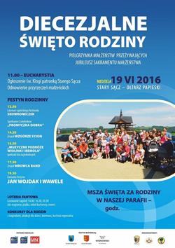 Rodziny z całej diecezji tarnowskiej przybędą do Starego Sącza na wspólne spotkanie. W niedzielę, 19 czerwca, przy Ołtarzu Papieskim odbędą się centralne obchody Diecezjalnego Święta Rodziny. Podczas mszy świętej małżeństwa obchodzące jubileusz odnowią przyrzeczenia małżeńskie. Zaplanowano też festyn z atrakcjami dla dzieci, młodzieży i starszych. Będzie to również ważny dzień dla Starego Sącza, gdyż św. Kinga zostanie ogłoszona Patronką Miasta.