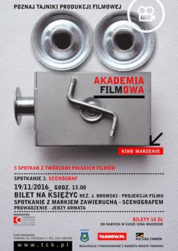 Zawód scenograf - to temat trzeciego spotkania realizowanej przez Tarnowskie Centrum Kultury Akademii Filmowej, cyklu w którym twórcy opowiadają o swojej pracy przy produkcji filmu, dzieląc się swoim doświadczeniem zawodowym odsłaniają tajniki profesji którą się zajmują. Każde ze spotkań składa się z projekcji wybranego filmu i spotkania z zaproszonym gościem.