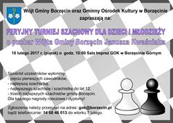 W piątek 10 lutego o godzinie 10.00 w Sali Imprez Gminnego Ośrodka Kultury w Borzęcinie rozpocznie się Feryjny Turniej Szachowy dla dzieci i młodzieży O Puchar Wójta Gminy Borzęcin Janusza Kwaśniaka. - W turnieju mogą wziąć udział uczniowie szkół podstawowych i gimnazjalnych z gminy Borzęcin, ale i także spoza gminy. Zapraszamy młodych szachistów z regionu – mówi Piotr Kania z borzęcińskiego GOK. Partie rozgrywane będą w systemie szwajcarskim na dystansie 7-9 rund, w zależności od liczby uczestników. Tempo gry wynosi 15 minut dla zawodnika. Sędzią głównym zawodów będzie Wiesław Kasperek z Tarnowa – zasłużony sędzia klasy państwowej, mając do pomocy sędziów pomocniczych. Wszyscy uczestnicy turnieju otrzymają nagrody rzeczowe i dyplomy. Liczba miejsc jest ograniczona, decyduje więc kolejność zgłoszeń, które już można przesyłać na adres: gok@borzecin.pl. Potwierdzenia obecności w turnieju należy dokonać do godziny 9.45 w dniu zawodów. Uczestnicy muszą także dostarczyć podpisaną przez rodzica zgodę na udział w turnieju.