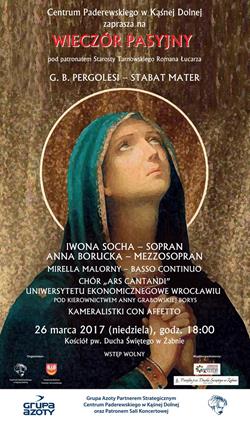 Dzieło Pergolesiego zostanie opowiedziane głosami sopranistki Iwony Sochy i mezzosopranistki Anny Boruckiej oraz chóru „Ars Cantandi” Uniwersytetu Ekonomicznego we Wrocławiu pod kierownictwem Anny Grabowskiej-Borys. Basso continuo zrealizuje Mirella Malorny. Artystom towarzyszyć będą Kameralistki Con Affetto.