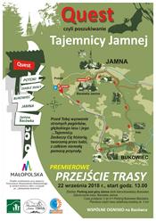 W ramach projektu "Tajemnica Jamnej" Stowarzyszenie „Jamna dla pokoleń” organizuje 22 września przejście wyznaczoną trasą po urokliwych zakątkach Jamnej. Quest jest narzędziem edukacyjnym, które udostępnia i interpretuje dziedzictwo miejsca. Ma formę zilustrowanej karty wyprawy, której treści i grafika poprawnie zinterpretowane wskazują trasę przejścia, czyli jest poszukiwaniem właściwej drogi. W queście "Tajemnica Jamnej" głównym bohaterem będzie rezerwat Diable Skały. Uczestnicy przejścia wyruszą o godzinie 13.00 z parkingu pod górą Jamna i po około 3-4 godzinach dotrą przez Bukowiec do Bacówki w Jamnej, gdzie na zakończenie odbędzie się wspólne ognisko. Udział w wycieczce jest bezpłatny i może uczestniczyć w niej każdy. Trzeba tylko we własnym zakresie dojechać na miejsce. Projekt realizowany jest przy wsparciu finansowym Województwa Małopolskiego w ramach konkursu ofert z turystyki "Małopolska Gościnna".