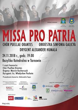 Najważniejszym punktem programu będzie utwór „Missa pro Patria". To dzieło Łukasza Farcinkiewicza - warszawskiego kompozytora, z którym chór „Puellae Orantes" współpracuje od 2012 roku. W poszczególnych częściach przeplatają się motywy zaczerpnięte z polskiej literatury muzycznej - polonezy i mazurki Fryderyka Chopina oraz pieśni: „Boże coś Polskę", „Jak szczęśliwa Polska cała", „Bogurodzica". W finale zabrzmi motyw „Mazurka Dąbrowskiego".