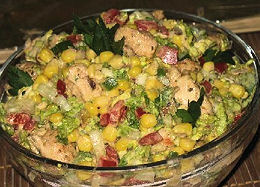 Dwa filety z piersi kurczaka kroimy w kostkę (0,5 cm) i smażymy na patelni, na oliwie z dodatkiem odrobiny masła. W trakcie smażenia posypujemy filety przyprawą GYROS (kamis). Odstawiamy do wystygnięcia. Potem wszystko układamy warstwami w przeźroczystej salaterce, w kolejności: kostka z filetów kurczaka, polewamy po wierzchu keczupem pikantnym, cebula pokrojona w kostkę, ogórki konserwowe pokrojone w kostkę, kukurydza, majonez kielecki, kapusta pekińska pokrojona w kostkę a na wierzchu czerwona papryka pokrojona również w kostkę. Układając warstwy doprawiamy solą i pieprzem tylko te, które nie są słone, czyli cebulę, kapustę pekińską i paprykę. Salaterkę, a właściwie szklaną miskę wkładamy na godzinę do lodówki. a potem.. Smacznego!