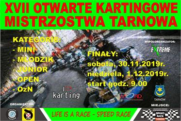 Małopolski Ośrodek Sportów Motorowych - Tor Speed Race Tarnów zaprasza na zawody kartingowe z cyklu XVII Otwarte Kartingowe Mistrzostwa Tarnowa 2019. Zawody odbędą się 30 listopada i 1 grudnia.