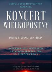 W najbliższy wtorek, 16 marca o godzinie 18.00, w Sali Koncertowej Zespołu Szkół Muzycznych w Tarnowie przy Lippóczy'ego 4 odbędzie się koncert wielkopostny. Na organach zagra dla publiczności prof. dr hab. Dariusz Bąkowski-Kois. Darmowe wejściówki można odbierać od 10 marca w szkole. Liczba miejsc jest ograniczona. W programie przewidziane są utwory Johanna Pachelbela, Johanna Sebastiana Bacha, Sigfrida Karg-Elerta, Charlesa-Marie Widora, Louisa Viernego oraz Marcela Dupre.
