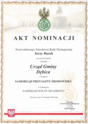 W kategorii „Samorząd Przyjazny Środowisku”,nominację jako „Samorząd wolny od azbestu” uzyskała, jako jedyna na Podkarpaciu, gmina Dębica.