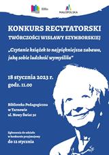 Do udziału w konkursie recytatorskim „Czytanie książek to najpiękniejsza zabawa, jaką sobie ludzkość wymyśliła” zaprasza Biblioteka Pedagogiczna w Tarnowie. Konkurs zorganizowany został w związku z ogłoszeniem przez Senat Rzeczypospolitej Polskiej roku 2023 rokiem Wisławy Szymborskiej. Przeznaczony jest dla uczniów szkół średnich, a jego celem jest zainteresowanie młodzieży poezją noblistki. Każdy z uczestników zaprezentuje dowolnie wybrany wiersz Wisławy Szymborskiej, a jury oceniać będzie interpretację słowną tekstu jego pamięciowe opanowanie, kulturę słowa oraz ogólny wyraz artystyczny.