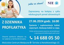 Kolejne spotkanie w ramach cyklu „Z dziennika profilaktyka” przeznaczone będzie dla kobiet spodziewających się dziecka oraz planujących ciążę. Spotkanie odbędzie się w czwartek, 27 czerwca o godzinie 16.00 w Mościckim Centrum Medycznym. Tematyka spotkania poświęcona zostanie suplementacji oraz urozmaiconym posiłkom, które są czynnikami prawidłowego rozwoju płodu. – W czasie ciąży ważne jest włączanie świeżych owoców i warzyw, pełnoziarnistych produktów zbożowych, chudego mięsa, ryb, jaj, orzechów i nasion – wyjaśnia dietetyczka Aleksandra Padło, która poprowadzi spotkanie wraz z położoną Grażyną Jakubowską.