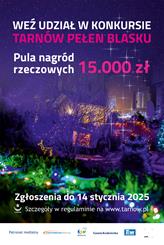 W czterech kategoriach: (I) balkony, (II) posesje, ogródki przyblokowe, (III) szkoły, przedszkola, żłobki i inne placówki edukacyjne oraz (IV) witryny sklepowe lub lokali gastronomicznych odbędzie się kolejna edycja konkursu Tarnów Pełen Blasku. W konkursie nagradzane będą najpiękniejsze zimowe dekoracje świetlne. Dekoracje oceni komisja konkursowa, która zwróci uwagę na: świąteczne elementy wprowadzone do obiektu, sposób wykonania iluminacji świetlnej, pomysłowość i kompozycję, inne elementy świątecznych dekoracji świetlnych - oryginalność, estetykę oraz harmonię z otoczeniem. W przypadku kategorii witryny – komisja oceni koncepcję plastyczną oraz estetykę wykonania. Wszystkie dekoracje nawiązywać powinny do polskich tradycji bożonarodzeniowych.