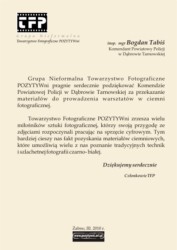 Towarzystwo Fotograficzne POZYTYWni w Żabnie otrzymało od Komendy Powiatowej Policji w Dąbrowie Tarnowskiej materiały służące do uzyskiwania fotografii metodą tradycyjną. Otrzymany prezent pozwoli zorganizować bezpłatne warsztaty dla amatorów tradycyjnej fotografii, a okazuje się, że chętnych jest sporo. 11 tysięcy sztuk papieru, wywoływacze, utrwalacze, negatywy i koreksy powinni wystarczyć na kilka szkoleń, po których z pewnością przybędzie mistrzów obiektywu. Bo mimo coraz nowszych aparatów cyfrowych i tych, które znajdują się w tradycyjnych „komórkach”, niektórzy twierdzą, że tylko tradycyjna fotografia ma duszę...