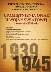 1 września o 19.00 w kościele księży Filipinów w Tarnowie odprawiona zostanie msza święta w intencji ofiar II wojny światowej. Po nabożeństwie uczestnicy przejdą pod Grób Nieznanego Żołnierza. Tam odbędzie się Apel Pamięci, złożone zostaną kwiaty, a później odbędzie się koncert orkiestry dętej Ochotniczej Straży Pożarnej w Woli Rzędzińskiej.