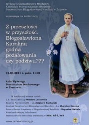 12 marca o godz. 11.00 w auli Wyższego Seminarium Duchownego w Tarnowie odbędzie się sesja „Z przeszłości w przyszłość. Błogosławiona Karolina godna pożałowania czy podziwu?” Organizatorem sesji i towarzyszącej jej wystawie są: Wydział Duszpasterstwa Młodzieży w Tarnowie, Katolickiego Stowarzyszenia Młodzieży Diecezji Tarnowskiej oraz Sanktuarium Błogosławionej Karoliny w Zabawie.