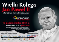 Monodram Haliny Kwiatkowskiej „Wielki Kolega – Jan Paweł II” jest jednym z punktów programu obchodów jubileuszu pięciolecia Warsztatów Terapii Zajęciowej im. Jana Pawła II w Tarnowie. Prezentacja spektaklu odbędzie się 18 października o godzinie 18.30 na dużej scenie tarnowskiego teatru. Wstęp za zaproszeniami, zaproszenie można uzyskać wysyłając maila na adres: biuro@wtzjp2.pl.