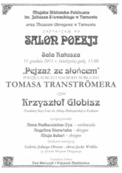 11 grudnia wznowione zostaną spotkania w ramach Salonu Poezji w tarnowskim Ratuszu. Uczestnicy pierwszego spotkania usłyszą m.in. poezję Tomasa Transtromera, laureata Nagrody Nobla za rok 2011 w interpretacji Krzysztofa Globisza.