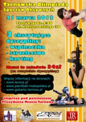 21 marca, w pierwszy dzień wiosny, a równocześnie w dzień wagarowicza, uczniowie szkół średnich będą mogli zmierzyć się podczas I Tarnowskiej Olimpiady Sportów Aktywnych. Połączone dyscypliny – karting, strzelectwo i wspinaczka, wymagać będą szybkości, wytrzymałości, zwinności i dużej koncentracji. Może okazać się to doskonałym sprawdzianem uzdolnień sportowych. Zwody odbędą się na torze Speed Race i ściance wspinaczkowej La Roca przy ulicy Kochanowskiego 30. Początek o godzinie 9.00. Wpisowe, dzięki pozyskaniu sponsorów, wynosi 34 złote, a dla najlepszych sportowców przewidziane są nagrody rzeczowe, puchary i dyplomy. Patronat nad imprezą objął Prezydent Miasta Tarnowa. Szczegółowych informacji udziela Kamil Wróblewski, tel. 663 220 356.