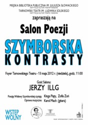 13 maja o godzinie 11.00 w foyer teatru usłyszeć będzie można wiersze Wisławy Szymborskiej w interpretacji tarnowskich aktorek Kingi Piąty i Zofii Zoń. Utwory zaczerpnięto z tomików: "Poezje", "Wszelki wypadek", "Dwukropek", "Rymowanki dla dużych dzieci", a także z ostatniego zbioru "Wystarczy". Gościem specjalnym Salonu będzie Jerzy Illg - krytyk literacki, wydawca, redaktor naczelny wydawnictwa ZNAK, który podzieli się z publicznością wspomnieniami o niedawno zmarłej poetce. Oprawę muzyczną Salonu przygotował Karol Mach. Wstęp wolny.