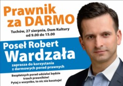 Dziesiąta edycja prowadzonej przez posła Roberta Wardzałę akcji „Prawnik za darmo" odbędzie się 27 sierpnia, tym razem w Tuchowie. Na zainteresowanych czekać będzie kilku prawników, którzy nieodpłatnie udzielać będą porad prawnych od godziny 9.00 do 15.00.